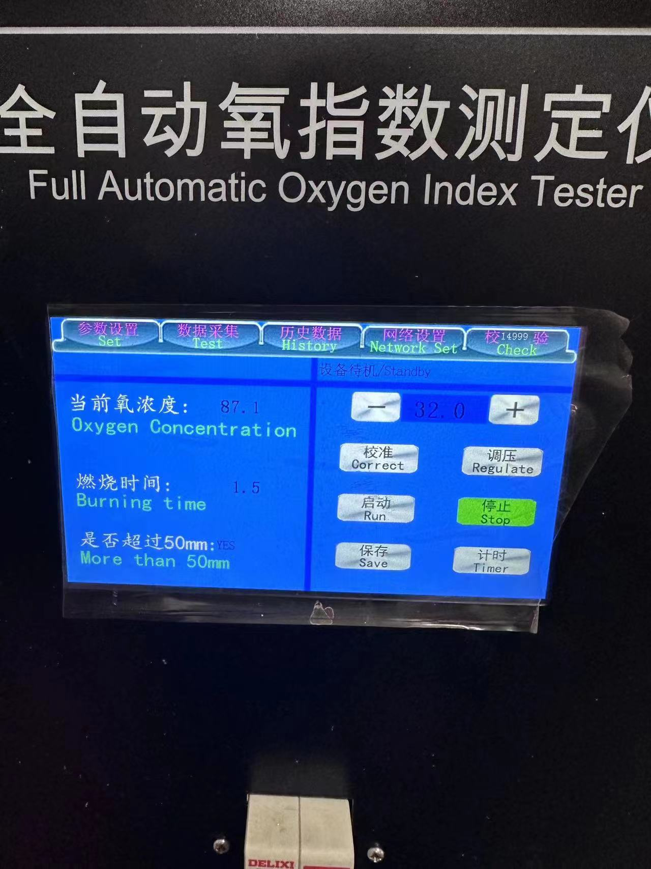 全自动氧指数测试仪据 GB2406 规定,燃烧简内混合气气体流速为 40 厘米/秒,据此选择流量,玻璃筒内径为 100mm,则流入筒内的混合气流量范围为: 14.1L/min~23.6L/min,例如氧气浓度为15%时可取氮气流量为 12L/min,氧气流量为 2.1L/min。取标准试样 10 根,(对每根进行测量,并记录在试样一端50mm 处划线,将另一端插入燃烧筒内的试样夹中,其安装位置应符合 GB2406 规定)。